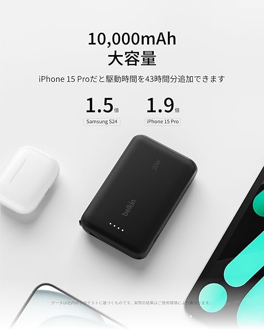 Belkin BoostCharge モバイルバッテリー 10000mAh、ケーブル一体型 モバイルバッテリー PD 20W、急速充電USB-C給電、iPhone 16シリーズ、iPad Pro、Galaxy S24対応