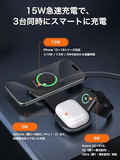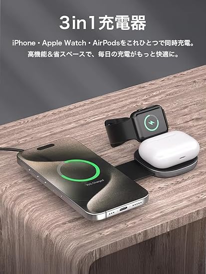 ◆これ1台でOK!Apple製品を3台同時ワイヤレス充電◆iPhone、Apple Watch、AirPodsをこれひとつでスマートに同時充電。3枚の充電パッドを搭載し、各種アップル製品を同時に置くだけで自動判別&最適出力で充電をスタートします。「デバイスごとに充電器が必要でゴチャつく…」そんな悩みを一掃!これまで複数使い分けていた充電器を1台に集約し、スッキリ快適な充電ライフを実現します。