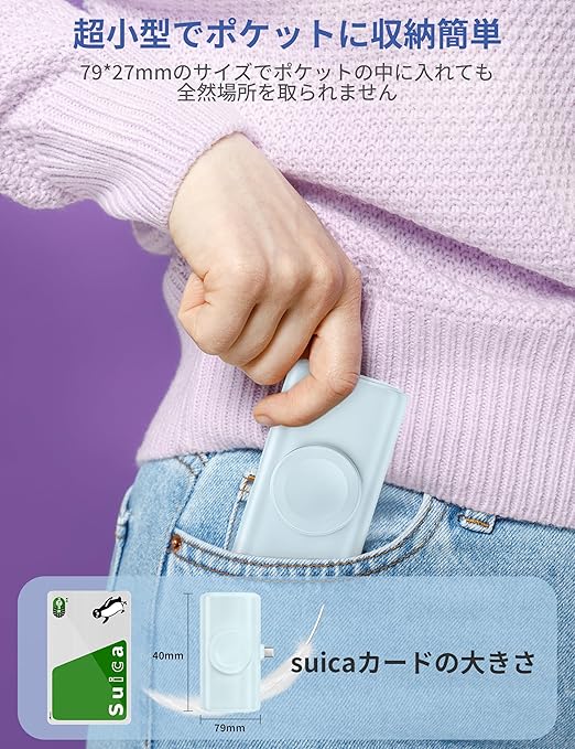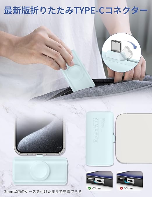 【折りたたみ式Type-Cコネクター・iPhone16/15をいつでも充電可能!】2024年業界新突破の折りたたみ式のType-C端子を搭載したモバイルバッテリーを登場しました!Type-C端子を軽く持ち上げる事でカチッと端子を立ち上げる事ができ,電源ボタンをオンにすると、ケーブル不要でスマホに直挿ししてすぐにiPhone15シリーズとandroidスマホ充電が可能です!これなら移動中でも場所を選ばずサッとiPhoneの充電ができます!本格的にワイヤレスモバイルバッテリーなので、モバイルバッテリ