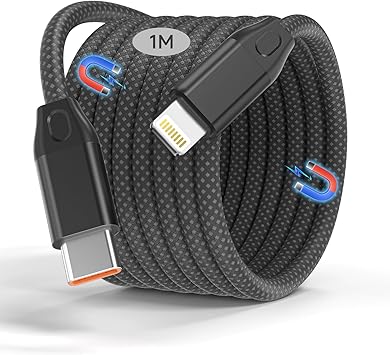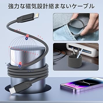 マグネット充電ケーブル USB-C Lightninケーブル 磁気自動収納 For iPhone充電 ライトニンケーブル 9V/3A 急速充電【1M】PD対応 同期データ転送 磁気 ナイロン製 巻きつき防止 防断線 lightninケーブル For iPhone14/13/12/11/X/XS/XR/8Plus 各種対応 -ブラック-1M a