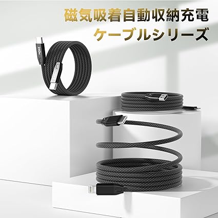 【磁気吸着自動収納】強力な磁石を内蔵し、ケーブルが自動的にきれいに整理されます。充電中でも、わずか1秒で簡単に収納でき、必要に応じて長さを最大1mまで調整可能です。コンパクトでスリムなデザインは、収納も簡単で、家でも外出先でも非常に便利に使えます。