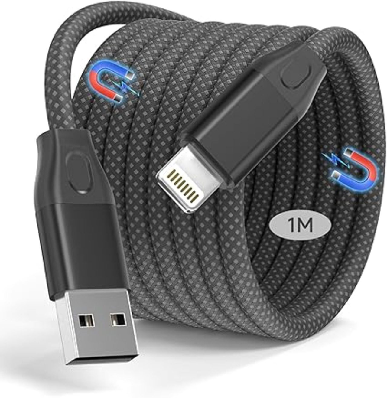 マグネット充電ケーブル For iPhone充電 磁気自動収納 ライトニンケーブル 5V/2.4A 急速充電充電【1M】同期データ転送 磁気 ナイロン製 巻きつき防止 防断線 lightninケーブル For iPhone14/13/12/11/X/XS/XR/8Plus 各種対応 -ブラック /1M a