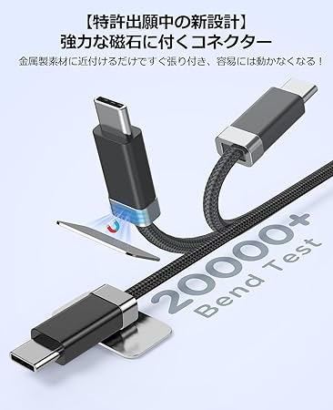 『USBC端子に磁石吸着固定機能、先端を探手間不要!導線整理にも便利!』本usb cケーブルの先端部分に強力な磁石が埋め込まれるによってケーブル固定具要らずにを壁面に一か所に定位置に保持され、ケーブルの先端を毎日探す難点をクリア!引っ付けるだけでサッと充電!※ケーブルはマグネット機能は付いておりません。