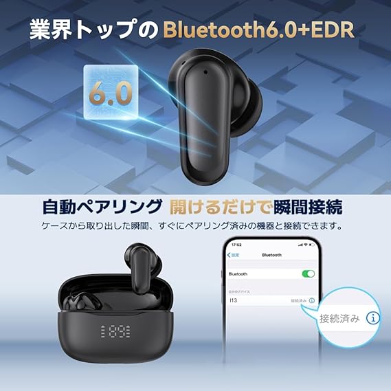 【最先端のBluetooth 6.0+EDR】 15メートル以内で高質で音声中継が特徴です。音飛びや音切れが一切なし。CVC 8.0ノイズキャンセリング技術は雑音が削減でき、聞くことに集中することができます。安心安全に使用することができます。ワイヤレスイヤホンBluetooth6.0チップを搭載しており、高速通信、ノイズ 低減を実現し、省エネ化及び音切れ・音ズレの防止力を大幅に改善されました。動画アプリだけではなく、ゲームアプリでも低遅延でスムーズに使えます。