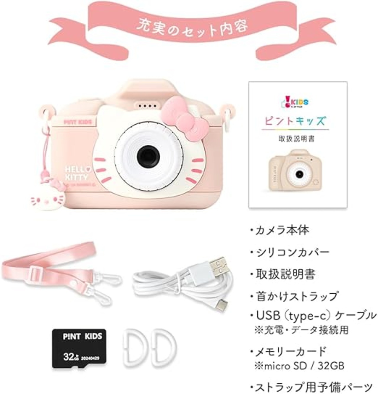 ピントキッズ キッズカメラ トイカメラ サンリオコラボ 日本企業 ハローキティ デザイン 子供用カメラ プレゼント 子供用 男の子 女の子 32GB インカメラ搭載 動画機能 撮影データ転送可能 音楽プレーヤー ゲーム機能 誕生日 クリスマス 取扱説明書付き (ハローキティ) a