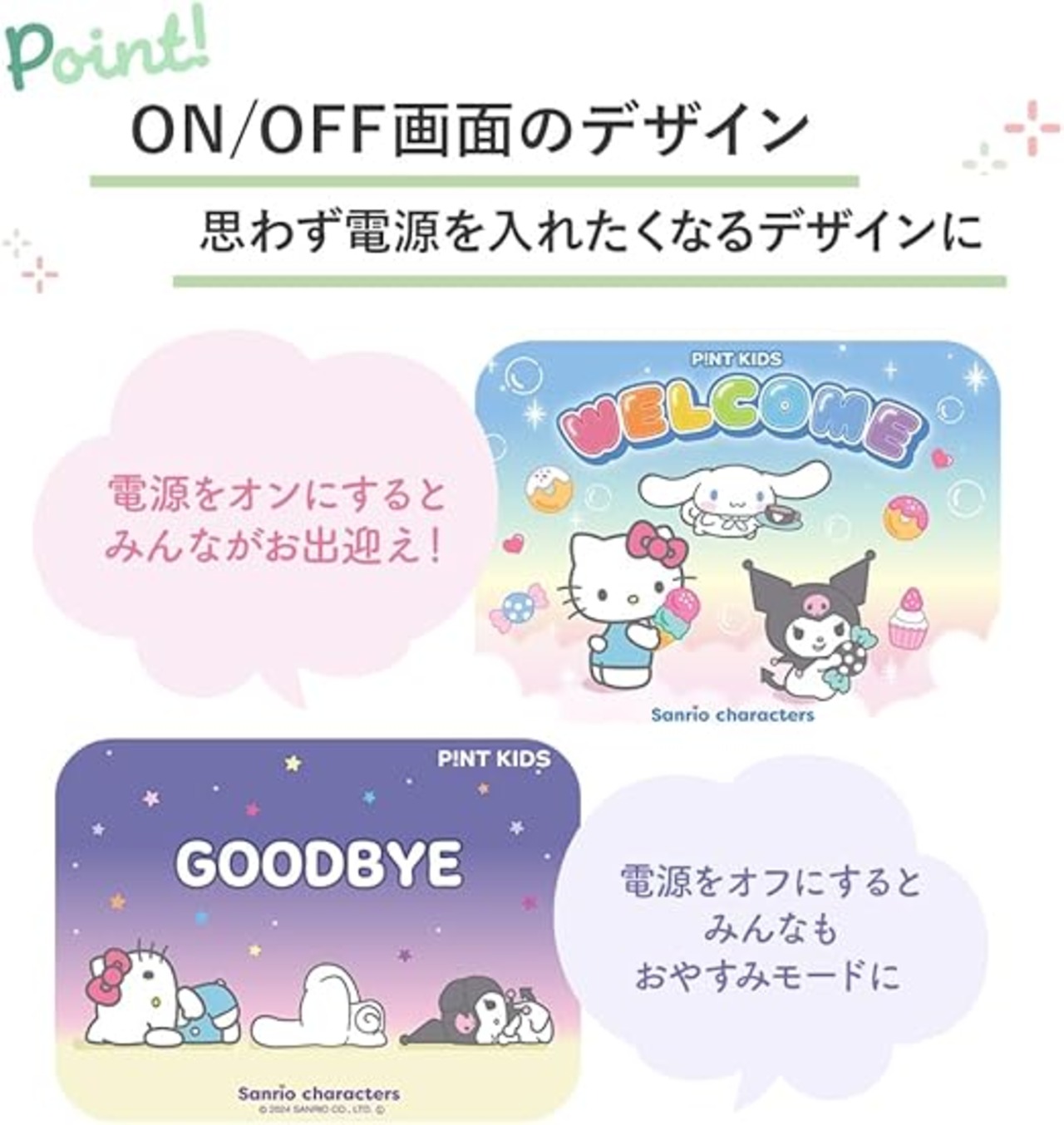 ■キッズトイカメラ「ピントキッズ」からサンリオキャラクターズコラボデザインが登場! ハローキティ(HELLO KITTY)、シナモロール(cinnamoroll)、クロミ(Kuromi)の3キャラクターに加えてマイメロディ(My Melody ) ポムポムプリン(Pompompurin) ぽちゃっこ(Pochacco)が新登場 大好きなキャラクターと一緒にお出かけを楽しもう◎ 【カメラデビューはサンリオキャラクターズと!笑顔あふれる毎日を】 ■ロットやキャラクターにより、パッケージやディスプレイ