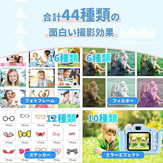 【高性能&多機能キッズカメラ】この子供 カメラは高画素なカメラを搭載し、鮮明で綺麗な写真と1080P HDのビデオを撮ることができます。高画質フロントカメラとバックカメラは自由に切り替えることができ、自撮りカメラとしてタイマー機能で簡単に自撮りもできます。子供 カメラの2.0インチスクリーンは、お子様の目を保護しながら、撮影内容をはっきりと映し出します。このキッズカメラには4倍ズーム機能も搭載されており、遠くまで鮮明に撮影し、美しい瞬間を記録できます。トイカメラには最大6時間のビデオ録画機能が搭