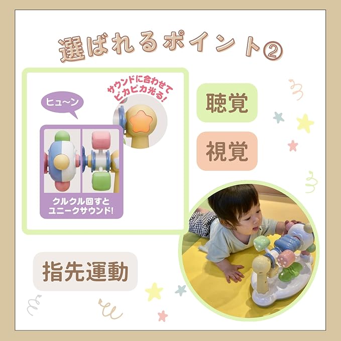 【赤ちゃんが大好きなクルクル遊び】赤ちゃんが大好きなくるくる遊びができるおもちゃです。ローラーを回すと流れるゆかいなサウンドと、ピカピカ光るライトが脳を刺激し、赤ちゃんの興味を長時間惹きつけます。中央のボタンを押すとゆかいな音が流れます。ユニークな音とピカピカライトで視覚と、ゆかいなサウンドで聴覚を育みます。楽しい動きと音楽で、赤ちゃん
