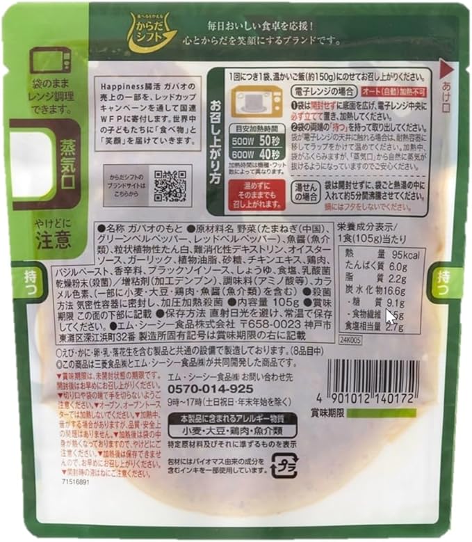 【原材料】野菜(たまねぎ(中国)、グリーンベルペッパー、レッドベルペッパー)、魚醤(魚介類)、粒状植物性たん白、難消化性デキストリン、オイスターソース、ガーリック、植物油脂、砂糖、チキンエキス、鶏肉、バジルペースト、香辛料、ブラックソイソース、しょうゆ、食塩、乳酸菌乾燥粉末(殺菌)/増粘剤(加工デンプン)、調味料(アミノ酸等)、カラメル色素、(一部に小麦・大豆・鶏肉・魚醤(魚介類)を含む)