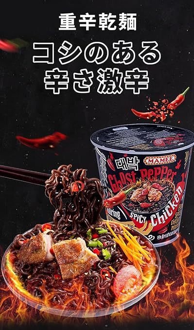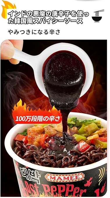 【強いスパイシーな匂い】ゴーストペッパーヌードルの匂いは強く独特で、強いスパイシーな香りに包まれる。この特徴的な匂いは、しばしば食欲を素早く呼び起こす。インド産の鬼唐辛子を厳選し、辛さ100万、非常に辛く、味ははじける