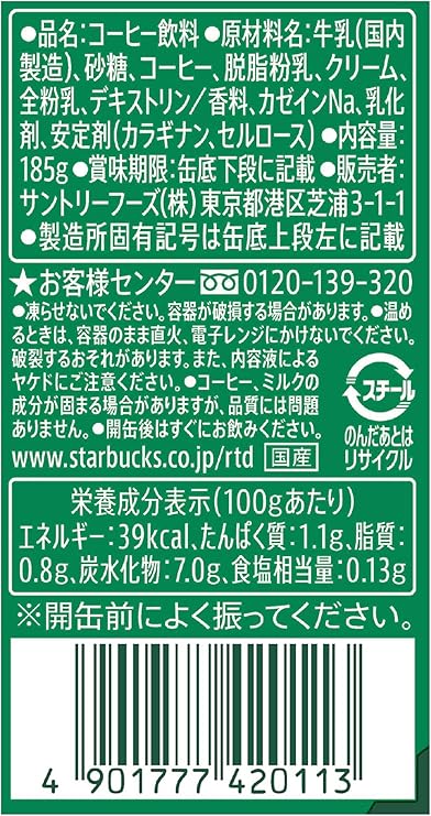 原材料:牛乳(国内製造)、砂糖、コーヒー、脱脂粉乳、クリーム、全粉乳、デキストリン/香料、カゼインNa、乳化剤、安定剤(カラギナン、セルロース)