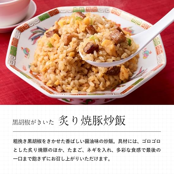 香ばしく炙った焼豚がゴロゴロと入った醤油味の炒飯。アクセントで粗挽きの黒胡椒をきかせています。