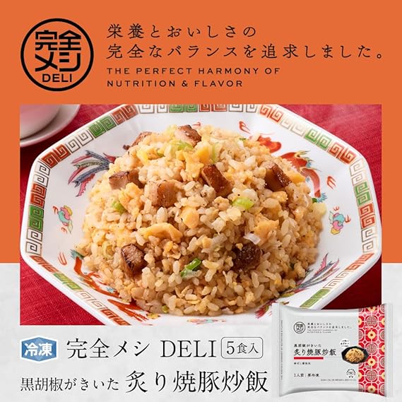 完全メシ DELI 日清食品 冷凍 黒胡椒がきいた炙り焼豚炒飯 5食セット レトルト 冷凍弁当 チャーハン 中華 焼豚 レンチン たんぱく質26.5g PFCバランス 食物繊維7.9g a