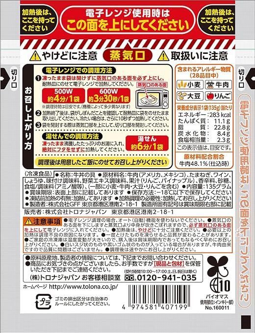 原材料名:牛肉(アメリカ、メキシコ)、たまねぎ、ワイン、しょうゆ、味付け調味料、野菜エキス調味料、果汁(りんご、パイナップル)、香辛料、砂糖、食塩/調味料(アミノ酸等)、(一部に小麦・牛肉・大豆・りんごを含む)