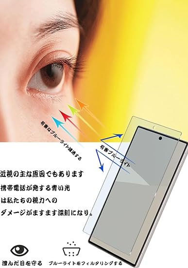 【ブルーライトカット】最新ブルーライトカット反射技術により93%のブルーレイを有効的にフィルタリングでき、目に掛かる負担を軽減し、視力障害を拒否します。長い時間使っても目が疲れません。効果的に近視を予防でき、ディスプレイを長時間眺める方に効果を発揮します。ブルーライトカット商品ですので、特徴な構造で画面は角度によって、淡い黄色、青紫色に見えます。予めにご了承ください。