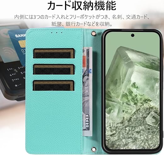 【カード収納機能&隠しマグネット設計】ピクセル8a ケース 手帳型の内側には3つのカード入れとフリーポケットがつき、名刺、交通