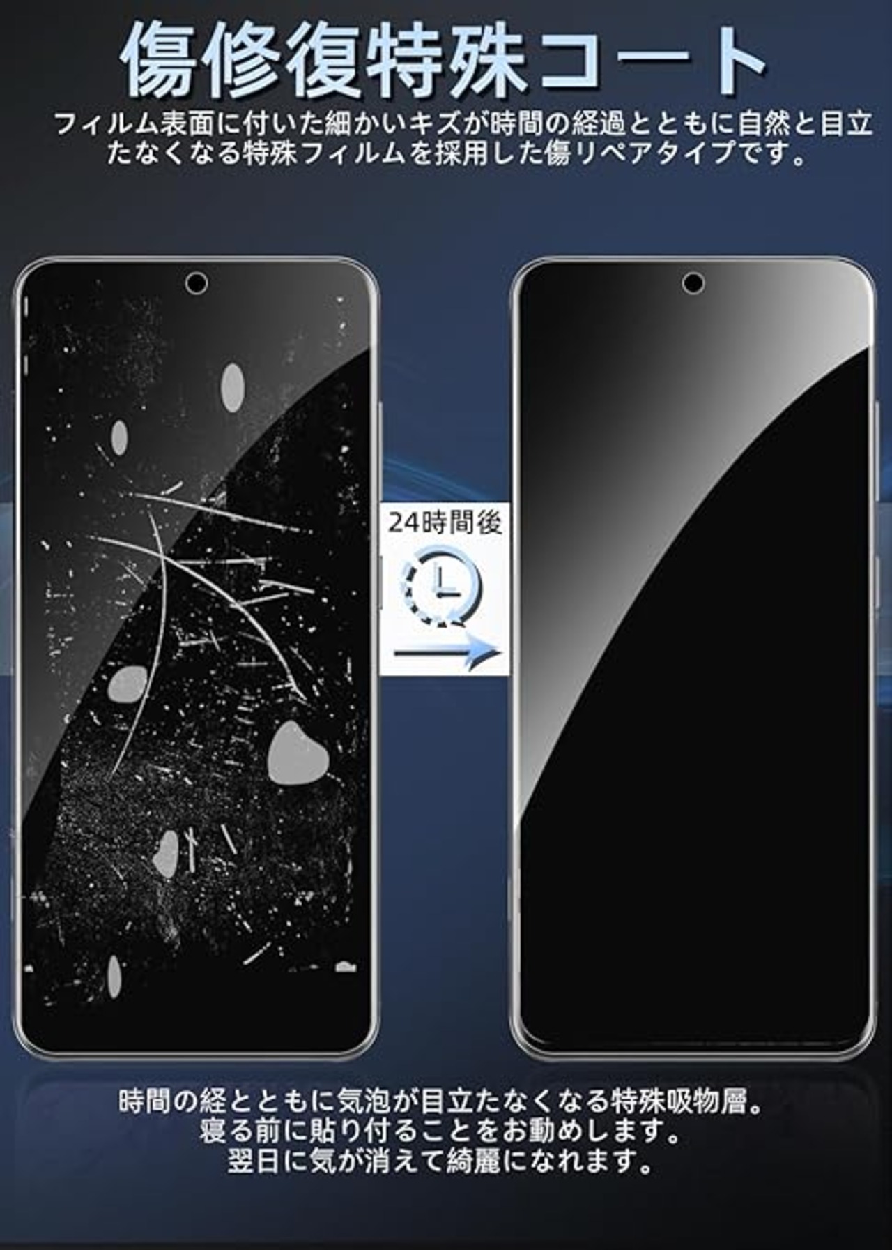 【ご注意】1.保護フィルムを貼り付ける前に、画面がホコリがないを確認下さい。吸着面に手に触れないで下さい。2.貼り付けた後、少し気泡を入りマスと、保護フィルムに傷をつかないため補助カード/手でフィルムを押しないでください。24-48時間以内に自然に消えて無くなりますのでご安心ください。3.周縁部分は指でウオッチ周縁を整理して、フィルムをスクリーンに密着させてください。