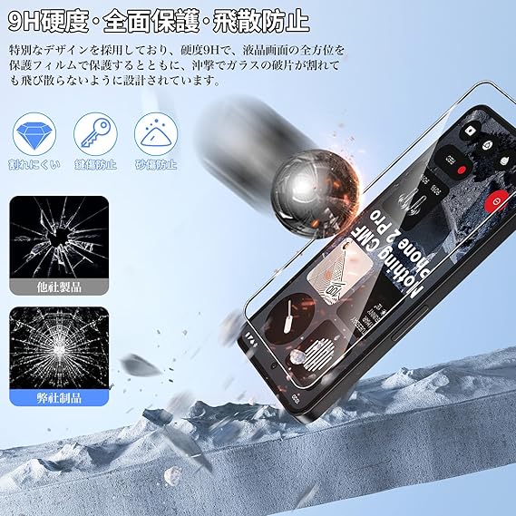 【9H硬度】日本製旭硝子材料を採用し、外部からの沖撃に強く、スマートフォンの画面への沖撃を防ぎます。また、特殊な飛散防止設計により、フィルムが割れても飛散せず、高い安全性を実現しています。スマートフォンを全面的に保護し、液晶画面の安全を守り、長く安心してお使いいただけます。