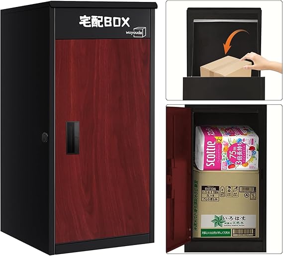 JPJieAnXin 宅配ボックス 大容量 屋外用 防水・防犯 完成品 置き配対応 複数投函可能 戸建て用 大型両開き扉 設置簡単 ステッカー付き おしゃれデザイン (レッドウッド, 特大) a
