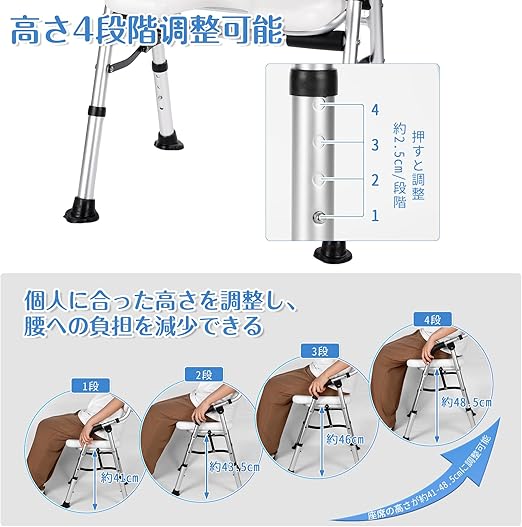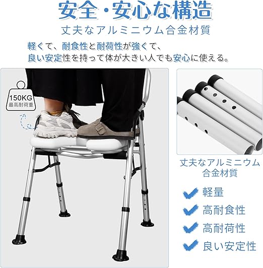 【高品質素材:高強度✚高耐食】この介護 風呂 椅子の本体は高品質のポリエチレンやアルミニウム合金で作られて、軽くて頑丈で、耐荷重は約150kgです。耐食性が高く、乾きも早いです。座