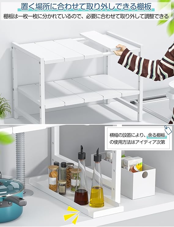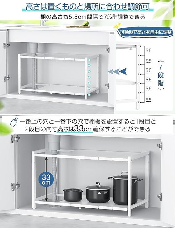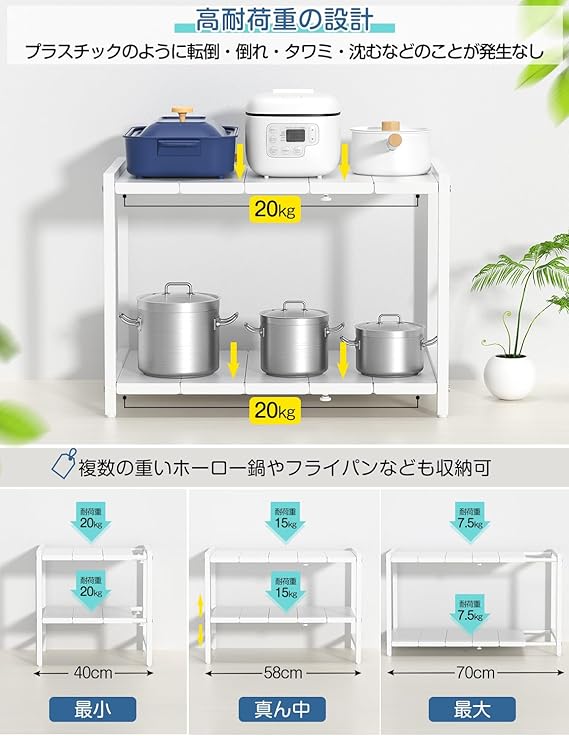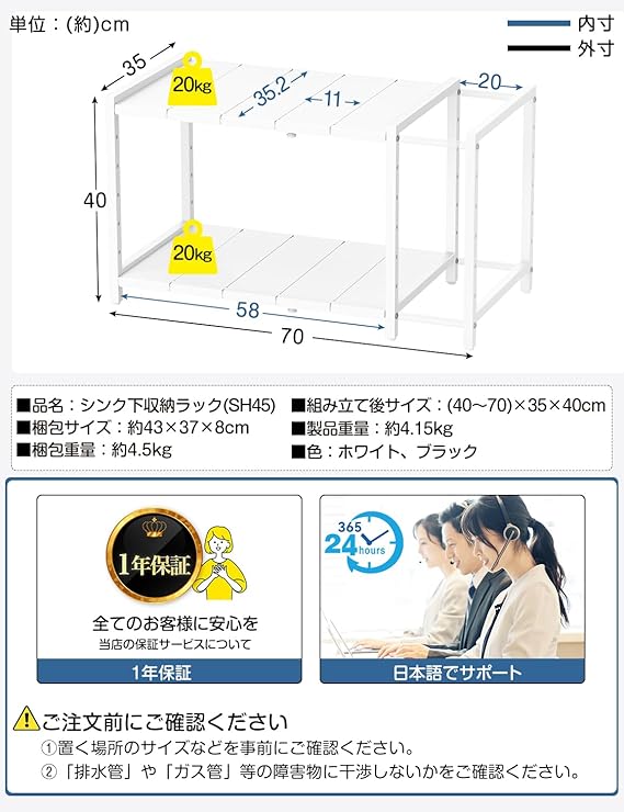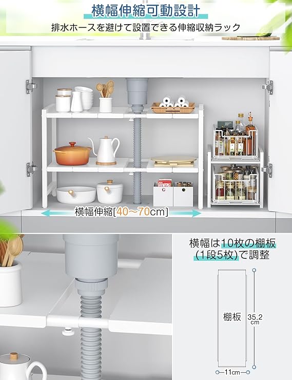 【シンク下収納伸縮ラック仕様】本体サイズ■横幅40~70cm×奥行き35cm×高さ40cm(7段階調節)■耐荷重量:最小幅40cm各段約20kg、真ん中幅58cm→各段約15kg、最大幅70cm→各段約7.5kg■取り外せ及び移動可の棚板:10枚■本体質量4.15Kg※組立目安:約10-20分です。■24時間電話及び日本語サポート:[email protected](祝日除外)