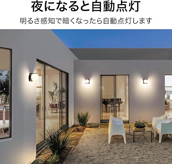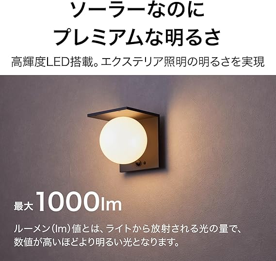 必要な時にしっかりと照らす人感センサーライト。玄関先をやさしく灯すやわらかな光の演出。モダンなエントランス照明。エクステリア照明として明るさを実現。高輝度LED搭載。リチウムイオン充電池内蔵で長く使える。人感・明るさ感知センサー搭載。人感センサーで動くものに反応して点灯(省エネ点灯)。明るさ感知で暗くなったら自動で点灯。ソーラー充電式で電源不要・電気代0円。電源を取りにくい場所に設置できる。電気代を気にせずに使用できる。用途に合わせて照らし方を選択できる。4つのモード切り替え機能付。ExLigh