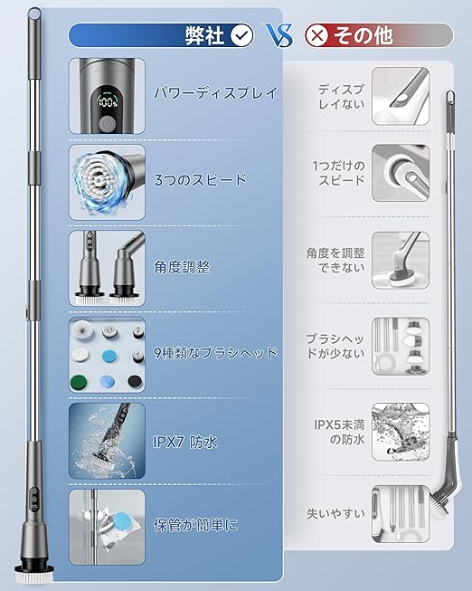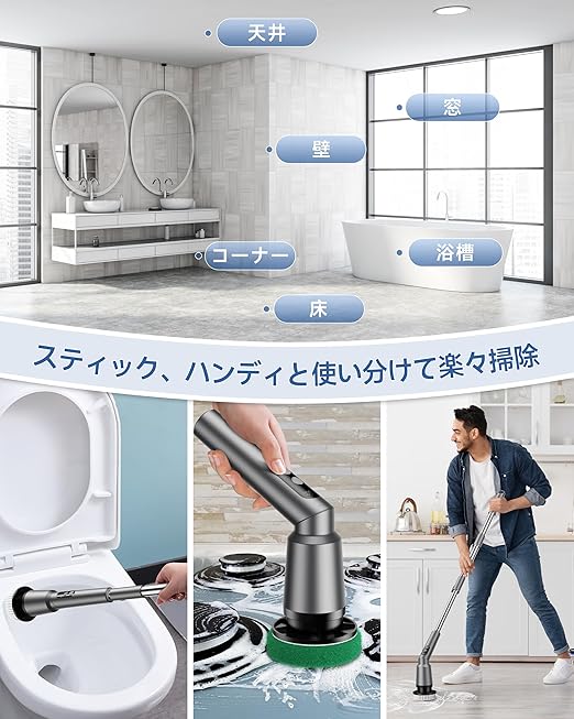 【9 in 1電動お掃除ブラシ& 取り外せる3段式設計】この電動お掃除ブラシには9種類の交換ブラシ(コーナーブラ