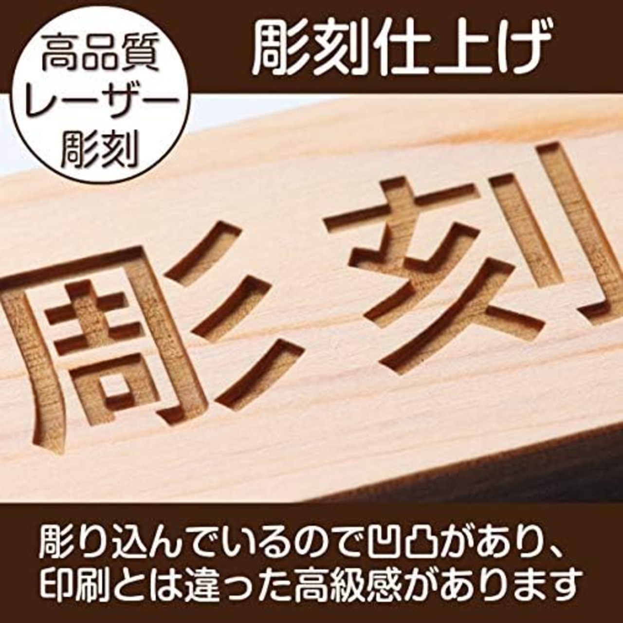 【詳細】国産ひのき(愛知認証材)にレーザー彫刻にて刻印しています ベース板の側面はレーザーカットによる炭化(黒色)で独特の雰囲気があります 裏面には強力な両面テープが標準で加工してあり、ツルツルで平らな面への取り付けは、貼り付けるだけです