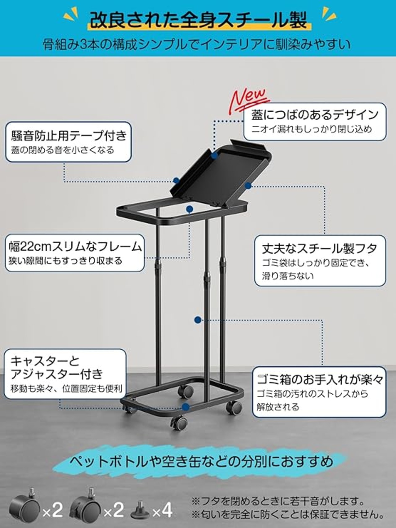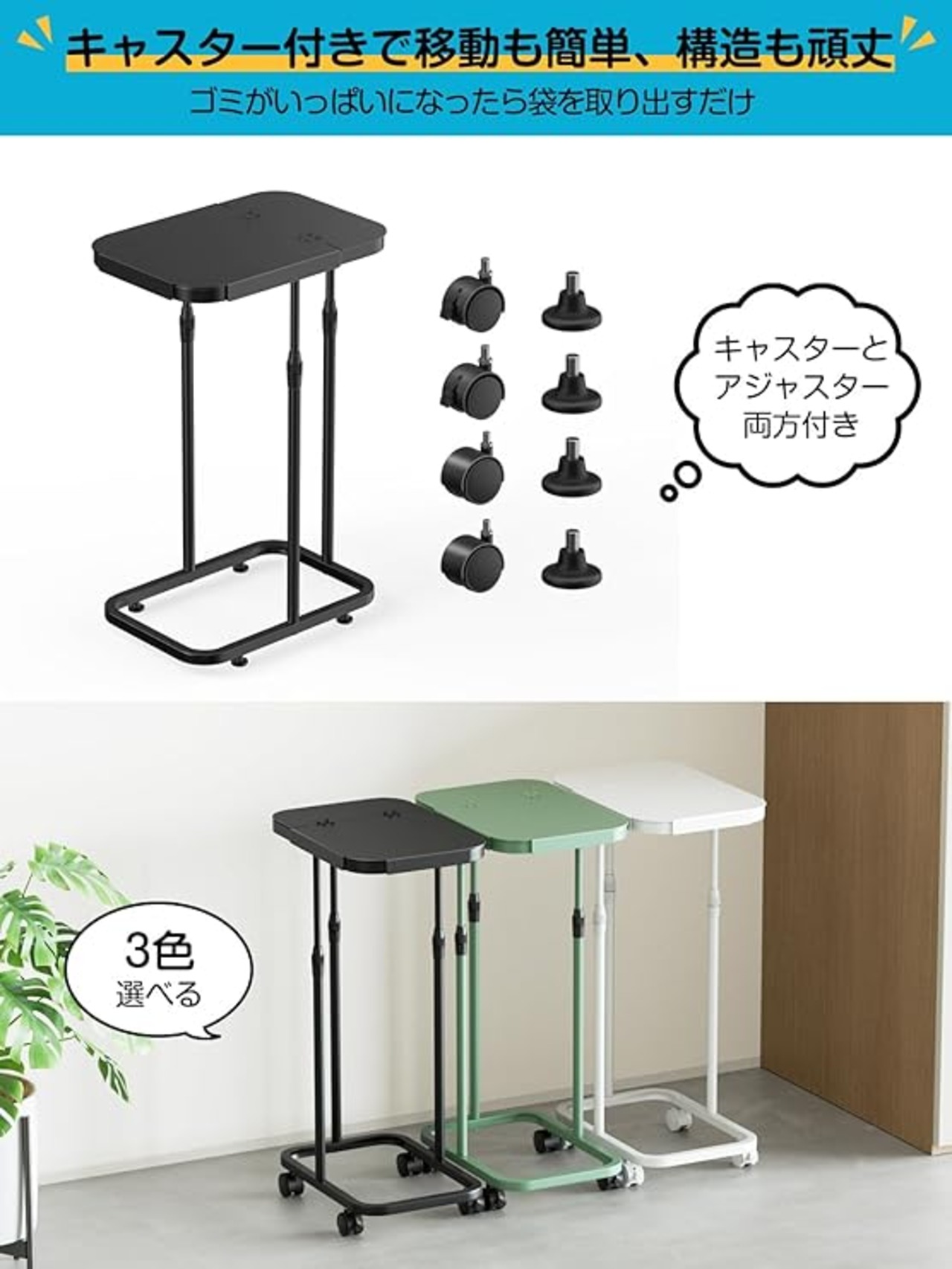 【便利なゴミ袋ホルダー仕様】 アジャスター付きサイズ:約33.5×22×(47.5~78)cm/キャスター付きサイズ:約33.5×22×(50.5~81)cm ◎重量:約2.2kg ◎材質:スチール(紛体塗装)対応ゴミ袋:20L~90L。ペットボトルや空き缶などの分別に便利なポリ袋ホルダー。