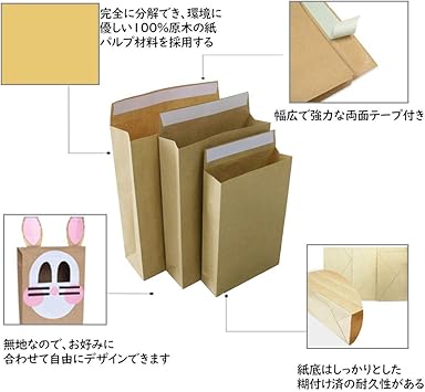 【素 材】100%原木の紙パルプ、未晒クラフト紙120g/1平方メートルあたり、中身が透けません。【サイズ】Mサイズ 50袋 (縦)390mm×(横)260mm×(マチ)80mm+ベロ部分55mm