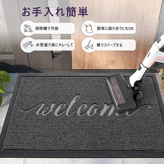 【汚れ排除機能】玄関マットの表面は 繊維の毛が硬くて、摩擦性があります。ドアマットに立ち上がると、靴底の土が落としやすい。屋外からの泥や土砂などを排除します。雨や雪などの汚れもすぐ吸収します。エントランスの清潔を守ります。
