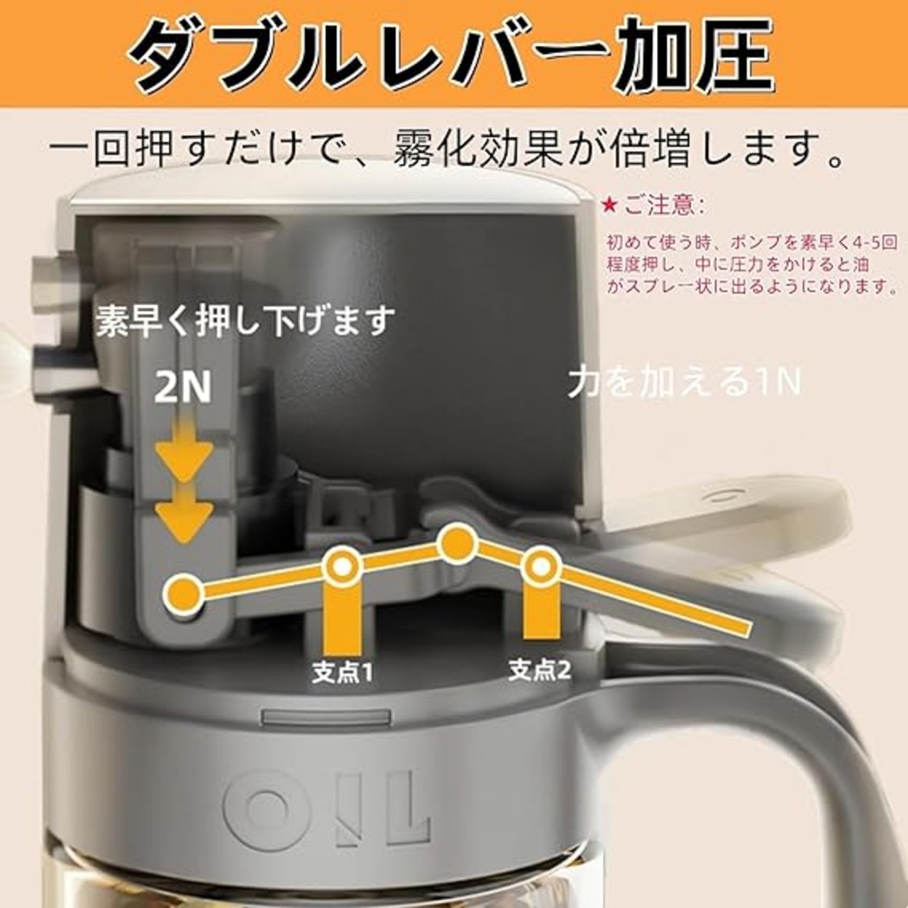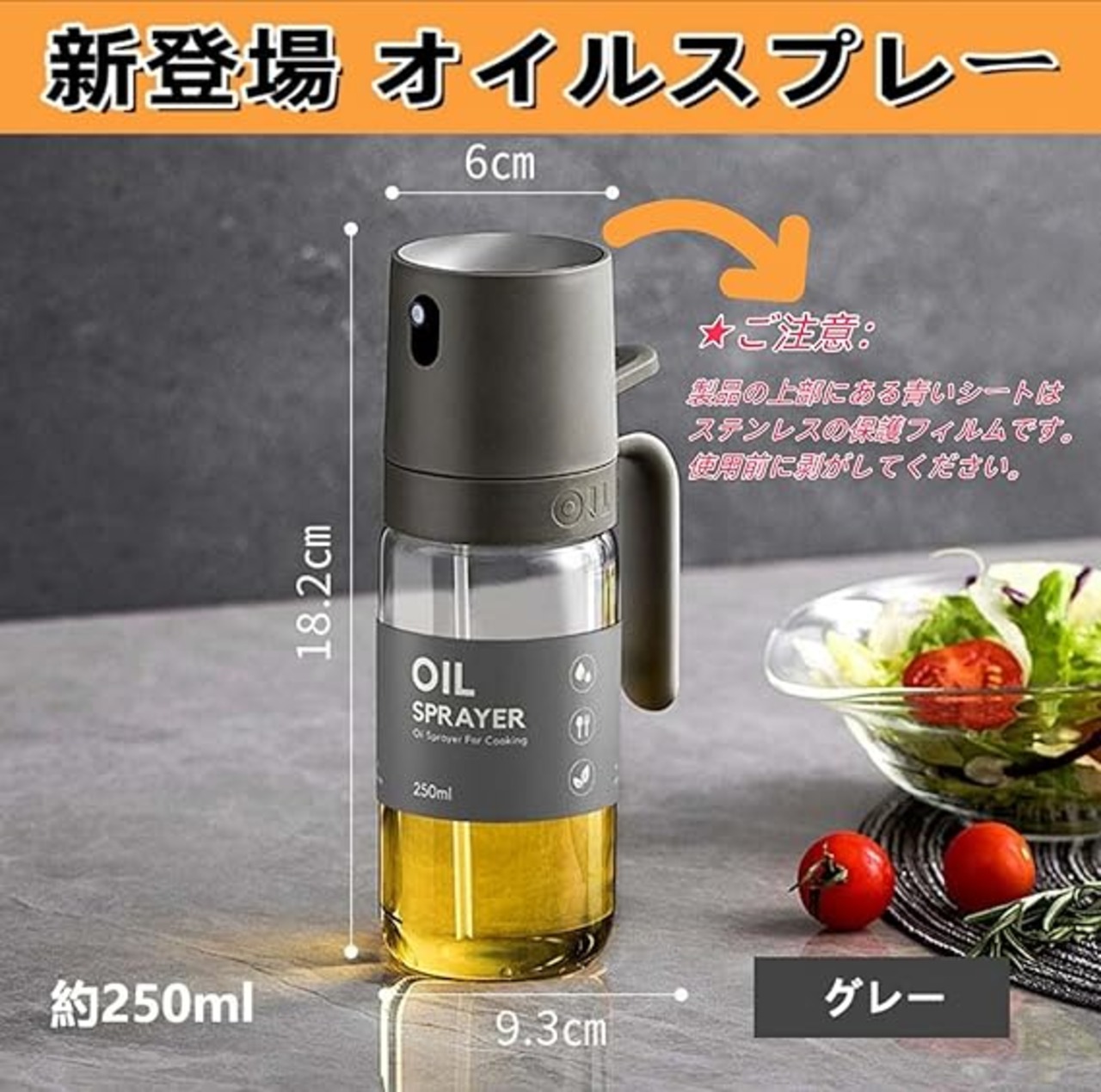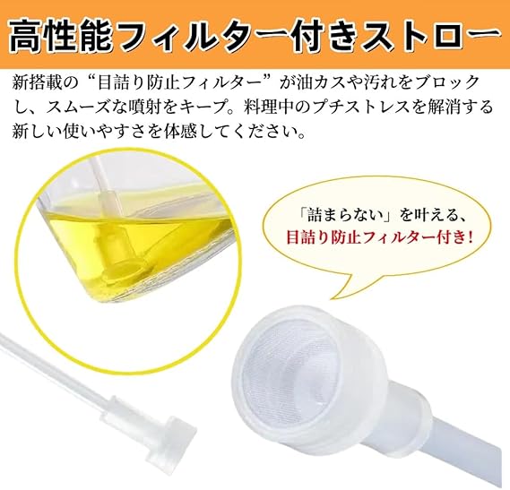 【液だれしない設計】独特の設計により、オイルが液だれすることなく、必要な量だけを正確にスプレーします。本体もキッチンも汚さずストレスフリー。(※ご注意:製品の上部にある青いシートはステンレスの保護フィルムです。使用前に剥がしてください。)