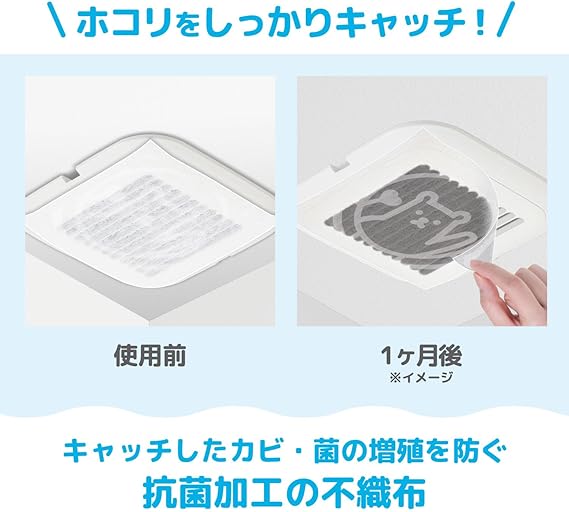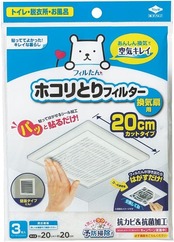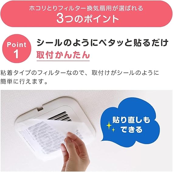 粘着タイプでシールみたいに簡単取り付け。トイレや脱衣所、お風呂の天井にある換気扇に付くホコリ汚れを防止するフィルターです。
