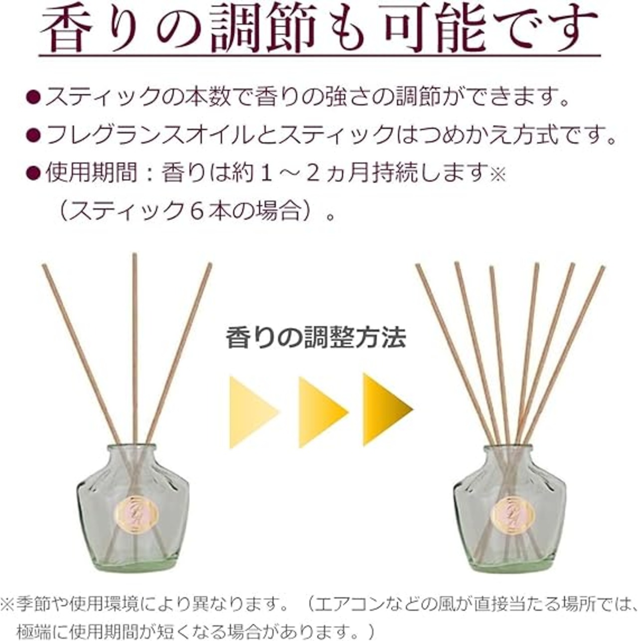 スティックの本数で香りの強さの調節が出来ます。通常約1~2ヵ月持続します(スティック6本の場合)。