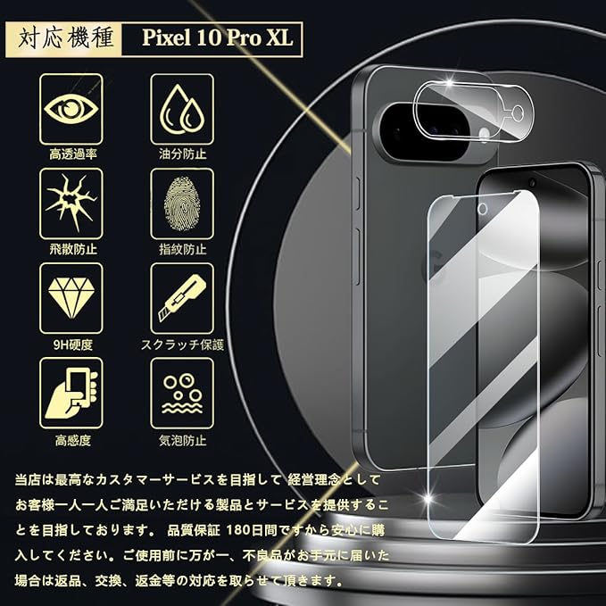 【対応機種】対応 google pixel10 pro XL 強化ガラス 保護フィルム おすすめ 2+2枚セット当店は最高なカスタマーサービスを目指して 経営理念としてお客様一人一人ご満足いただける製品とサービスを提供することを目指しております。※この機器は周辺部が曲面となったラウンド仕様のため、保護フィルムを端まで貼ることができません。もしフィルムがスマホスクリーンをフルカバーするなら、2?3 mm浮かぶ可能性があります。そのため、表示部分よりも保護フィルムが小さくなっています。フィルムの剥が