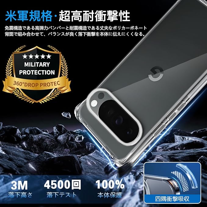 【米軍規格・超高耐衝撃性】 米軍基準のタフさを誇るグーグルピクセル10プロ XL ケース。コンクリートの地面に厚さ5mmの合板を敷き、高さ2mから合計26回、違う角度から落下させる実験をしましたが、本体