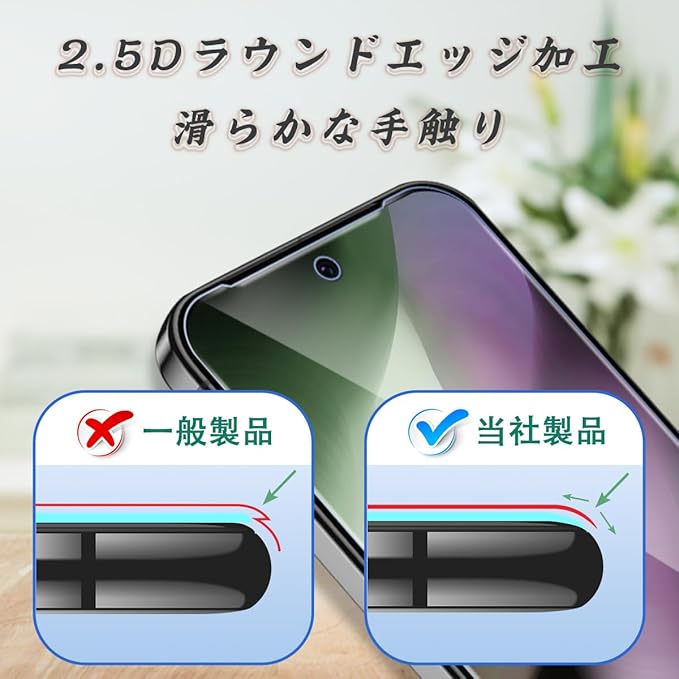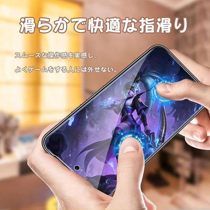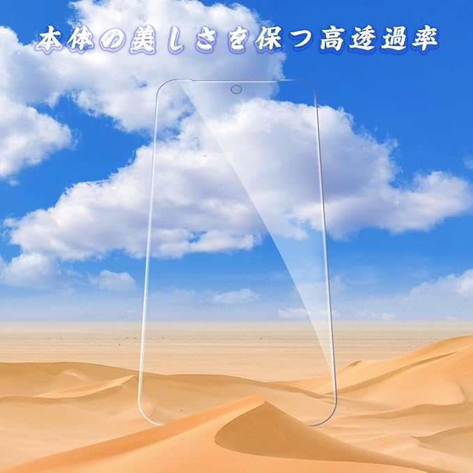 【日本製旭硝子製素材】表面硬度9Hと非常に高い硬度の持つ素材を採用し、外部の衝撃を吸収し、画面への損傷を最小限に抑えることができます。縁にかかる衝撃が軽滅しガラスフィルムの耐久性にも向上させます。特殊な飛散防