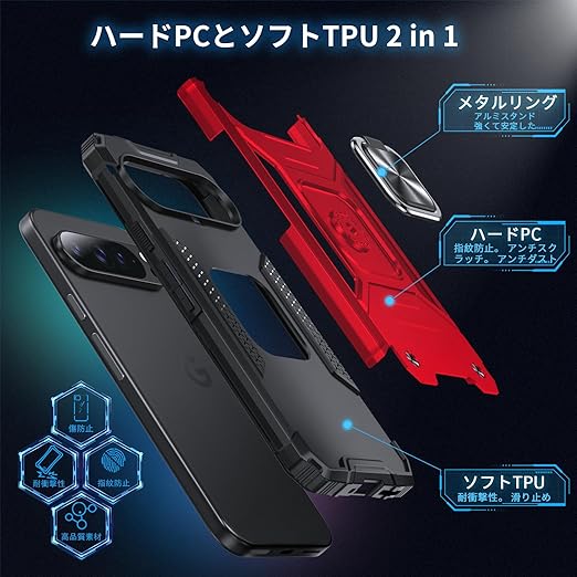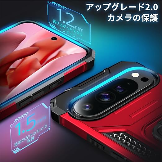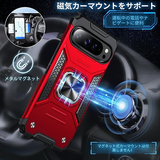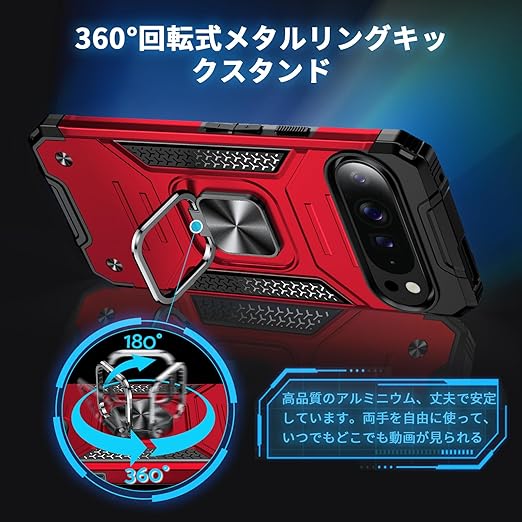 DASFOND Google Pixel 9 Pro XL ケース 360度回転メタルリングキックスタンド付き 米軍MIL 耐衝撃 強化PCハードバック 傷つけ防止 スマホケース グーグルピクセル9プロXL カバー 6.8 インチ レッド a