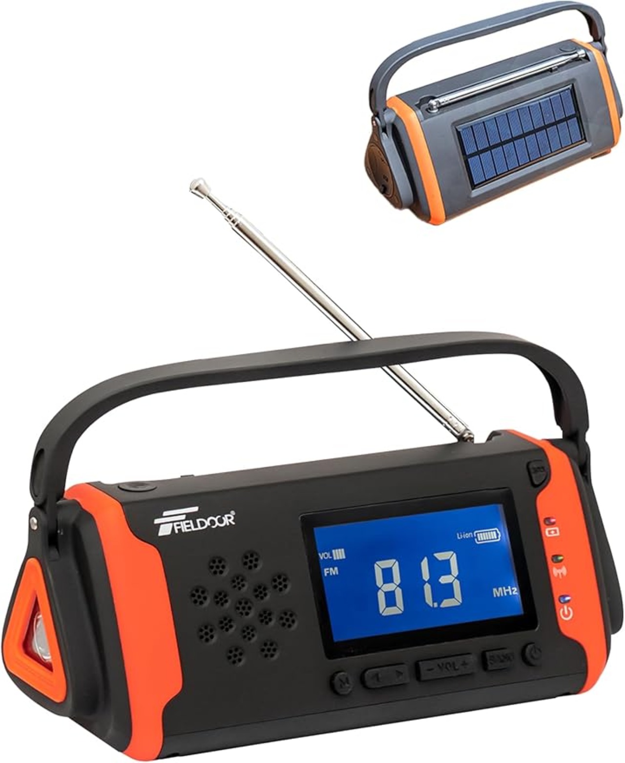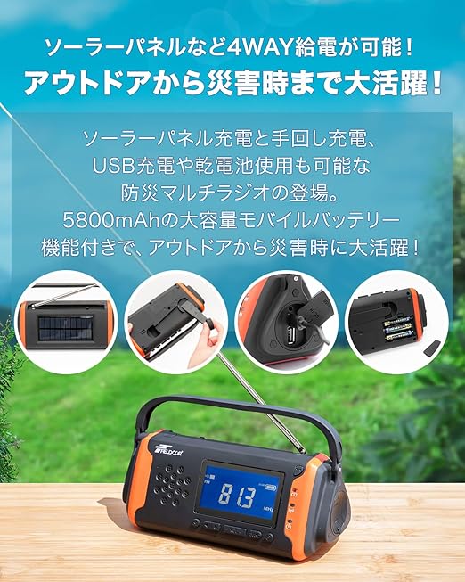 FIELDOOR 防災ラジオ 手回し ソーラー 多機能 小型 高感度 乾電池 スマホ充電 USB 充電 AM FM ラジオ LEDライト SOSアラーム 5800mAh モバイルバッテリー イヤホンジャック 耐機能防災 ポータブル 非常用 懐中電灯 デジタル a