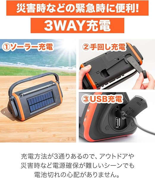 【AM/FMラジオ】災害時の現状把握と情報収集に役立つラジオはAM/FMに加え、ワイドFM*にも対応。アウトドアや普段のラジオ鑑賞にも使えます。 【3WAY充電】充電方法が3通り(ソーラー充電、手回し充電、USB-C充電)あるので、アウトドアや災害時など電源確保が難しいシーンでも電池切れの心配がありません。 【単4形乾電池も使用可能】本体内蔵のバッテリーだけでなく、単4形アルカリ乾電池3本(別売り)をセットして使用することもでき、使い勝手抜群。 【モバイルバッテリー機能】緊急時に役立つモバイルバ
