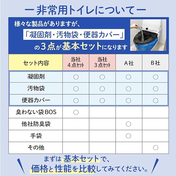 私たちは臭わない袋BOSを製造・販売しているメーカーです。蓄積された知識、独自の開発力、メーカーならではの利点を活かした非常用トイレセットを開発しました。品質・価格に自信を持っています。