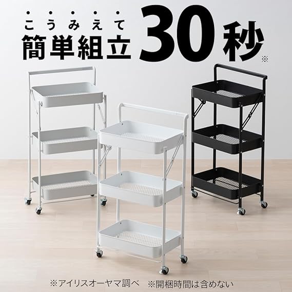 【約30秒(※)で組み立て可能】“1:本体を開く/2:製品をロック/3:キャスターを取り付ける”だけ。工具不要でかんたんに組み立てができる。折りたためるから、使わないときはコンパクトに収納可能。(※アイリスオーヤマ調べ。開梱時間は含めない。)