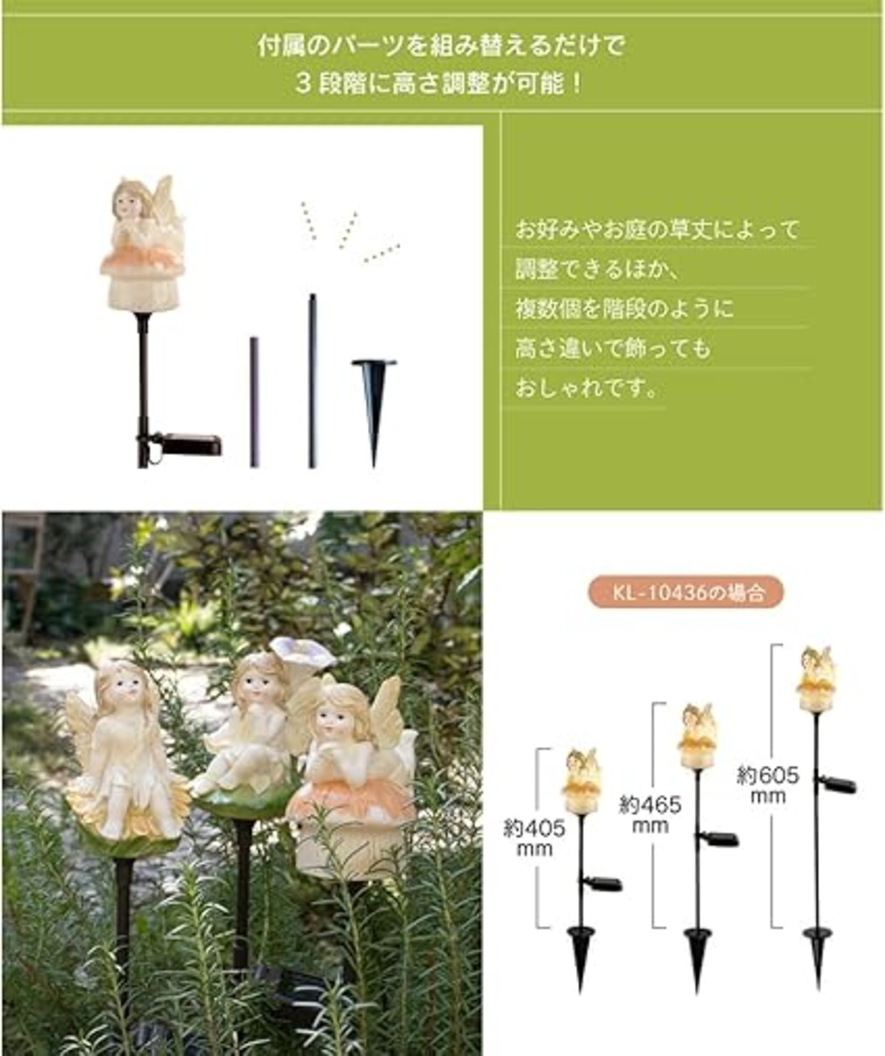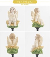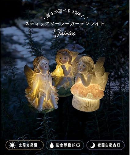 まるで陶器のように艶やかなお花の妖精たち。どの角度から見ても可愛らしい、繊細な作りです。ソーラーパネル付で自動充電&夜間自動点灯。暗くなると電球色の暖かい光がふんわりと灯ります。