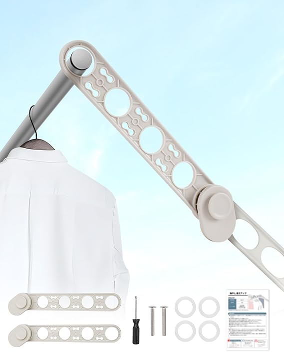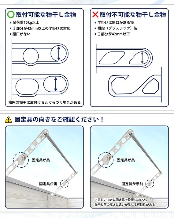 1.【ご購入前の必ずご確認ください】:弊社の物干し竿延長バーは直径42㎜に対応しております。穴の直径が42㎜未満の物干し金物、幅が20mm以上の物干し金物、樹脂製の物干し金物には取付不可となります。ご了承ください。ご注意:ご購入前に、ご自宅の物干し金物が取り付け可能かどうかを必ずご確認ください。両方の固定具を奥側に設置してください。正しい向きで設置されていない場合、物干し竿の高さに違いが生じる可能性があります。ご注意:12mm以下の物干しは薄くて、装着する場合、付属のゴム輪でぐらつく状況を改善で