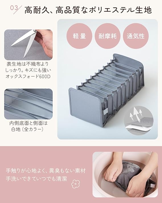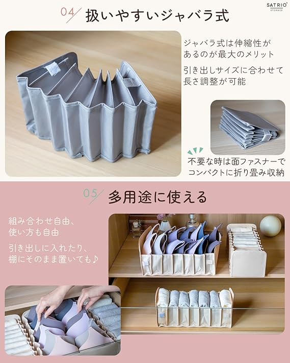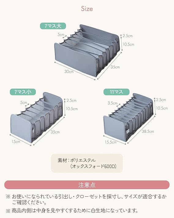 【整理収納のプロ推薦 】Satrioボックス型下着収納ケース3点セット。多機能、大容量、タンスやチェスト内の整理整頓に便利な収納ケース。組み合わせも使い方も自由。下着、靴下、Tシャツ、レギンス、タオル等の収納に最適。アイディア次第で下着以外(小物入れ、化粧品等)の収納にも◎。ご自身の好きな組み合わせで自由にレイアウト可能。大容量の25マス!7マス小×7マス大×11マスの3点セット。目的に応じて、7マス小×3、7マス大×3、11マス×3、同じ型3点セットもお選び頂けます!