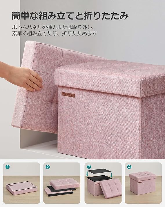 【多機能デザイン】脚台としても使える便利な収納スツールです。玄関で靴を履く時の腰掛けや、突然の来客時の椅子として活用できます。また、お子様の整理習慣を育むためにもおすすめです。おもちゃ、雑誌、衣類などの生活用品を整理整頓して収納することができ、スペースをきれいに整えます。