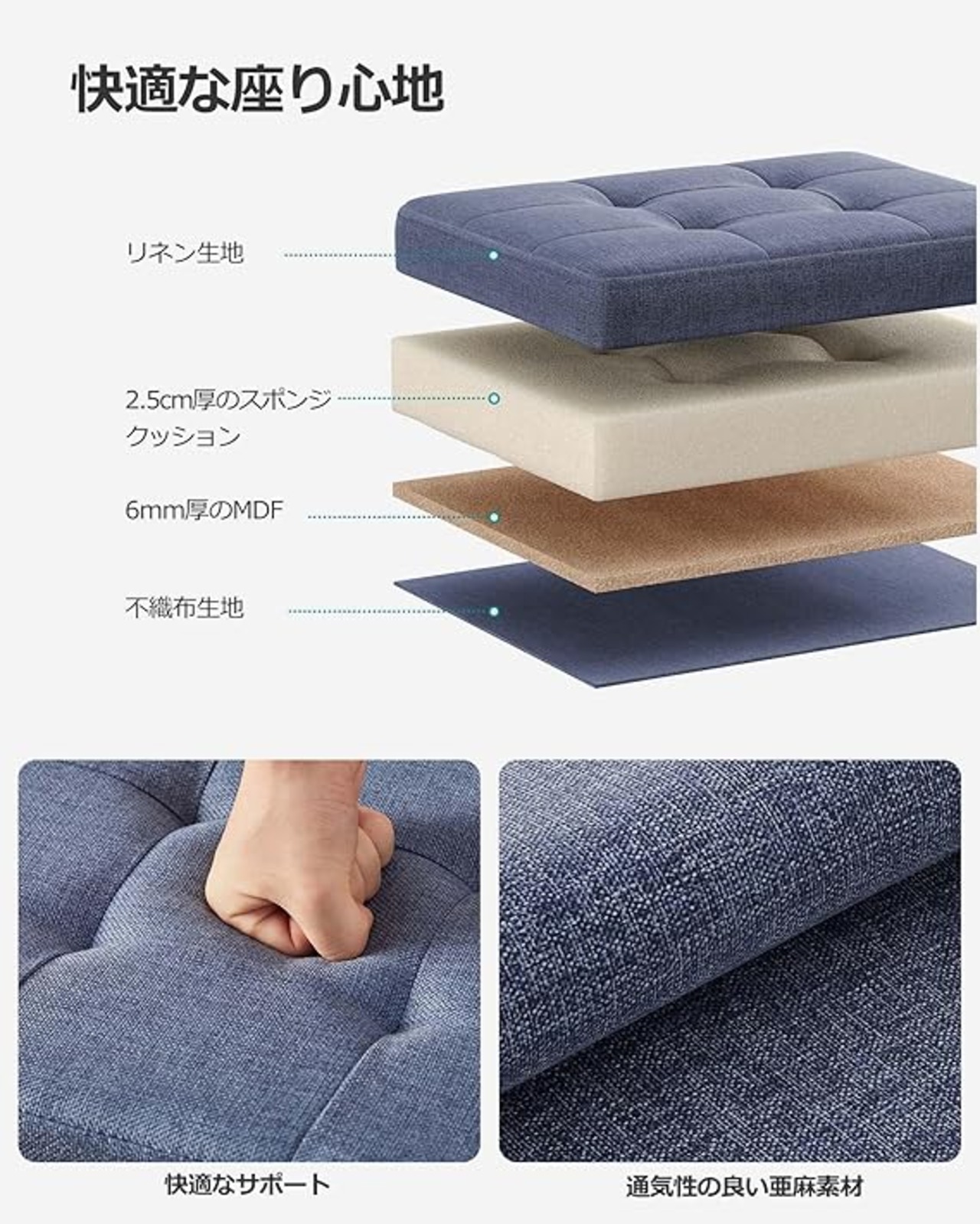 【快適な座り心地】座面には2.5CM厚のスポンジクッションと通気性の良い亜麻素材を使用しており、柔らかく快適な座り心地を提供します。くつろぎの休憩や一時的な座席として使用する際も、快適な感触をお楽しみいただけます。