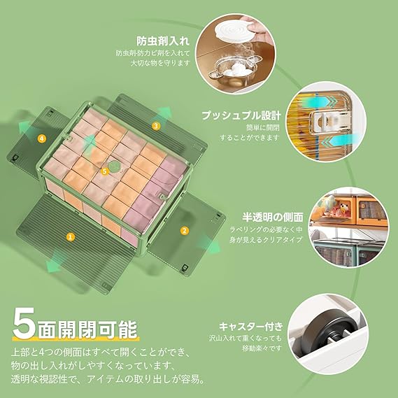【5方向フルオープン機能】 前後左右+天面の全方向アクセス可能!布団収納時は上から、おもちゃ出し入れは前面からと、シーンに合わせた使い分けが自由自在。