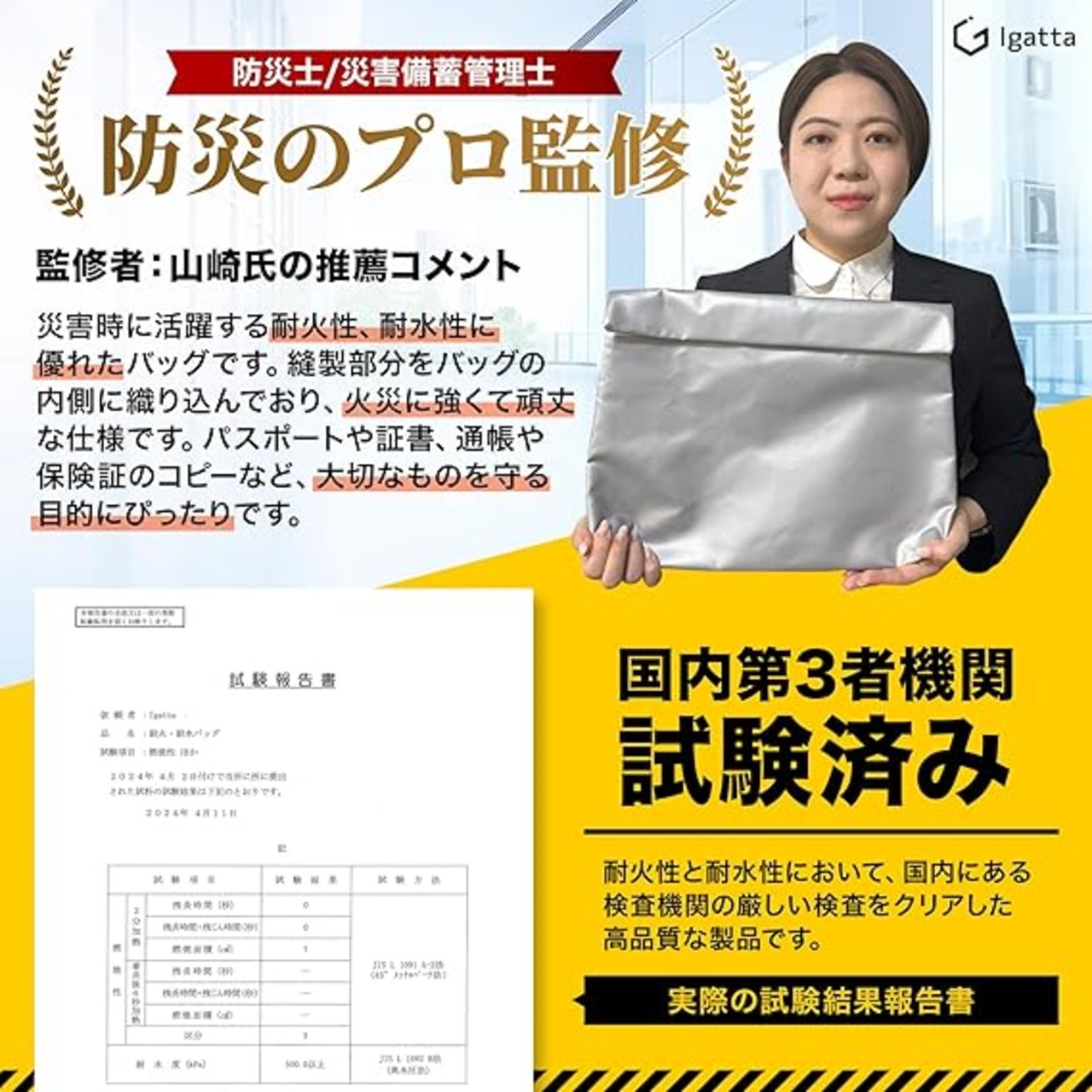 耐火バッグ 【防災士/災害備蓄管理士監修】 金庫 防災バッグ 国内試験機関検査済み 貴重品バッグ 38×27×8cm 耐火耐水 セーフティーバッグ Igatta (Lサイズ) a