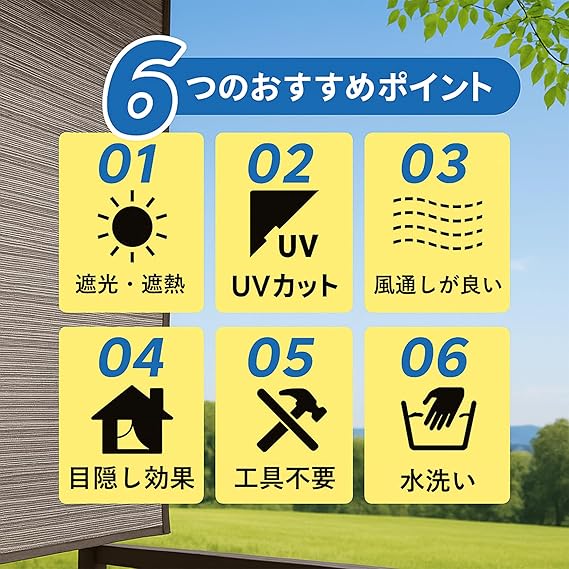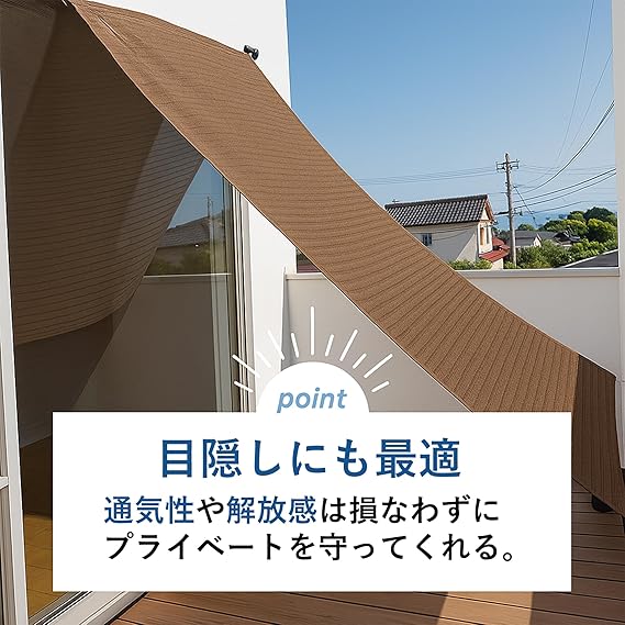 「遮熱・目隠し効果でプライバシーも安心」メッシュ素材により通気性を確保しながら、視線を遮る目隠し効果を発揮。外からの視線を遮りつつ、室内やテラスを涼しく快適に保ちます。プライバシー保護にもおすすめ。